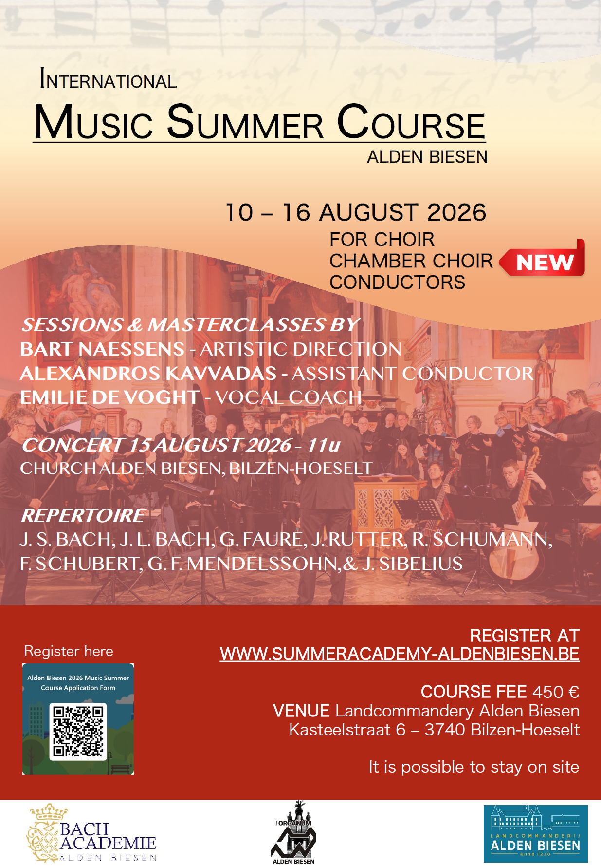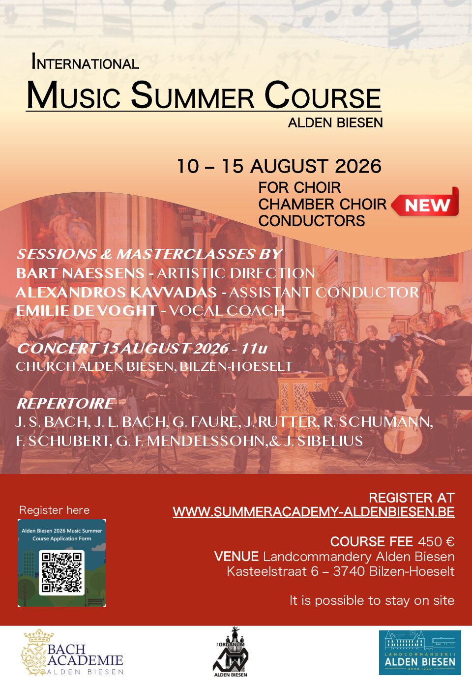 Naast de koorstages biedt de Zomeracademie Alden Biesen dit jaar ook een traject aan voor jonge dirigenten die hun ervaring met het dirigeren van koor en vocaal ensemble wensen te verdiepen. Dit traject is bedoeld voor dirigenten met enige ervaring die intensief willen werken aan repetitietechnieken, slagtechniek, partituurstudie en artistieke communicatie.